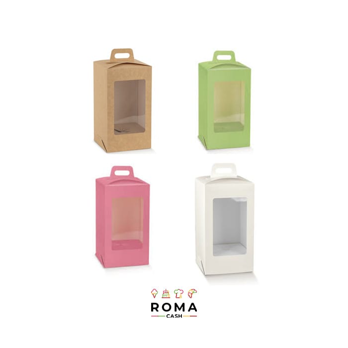 Scatola packaging elegante e resistente composta da fondo in cartone accoppiato con foro fustellato e corpo superiore in cartoncino teso, dotata di pratica maniglia e finestra frontale in PVC trasparente. Ideale per confezionare uova di Pasqua, soggetti e creazioni in cioccolato, valorizzando il prodotto grazie alla perfetta visibilità e a una presentazione curata. Disponibile in diverse misure e colorazioni, è la soluzione perfetta per pasticcerie, cioccolaterie e confezioni regalo professionali.